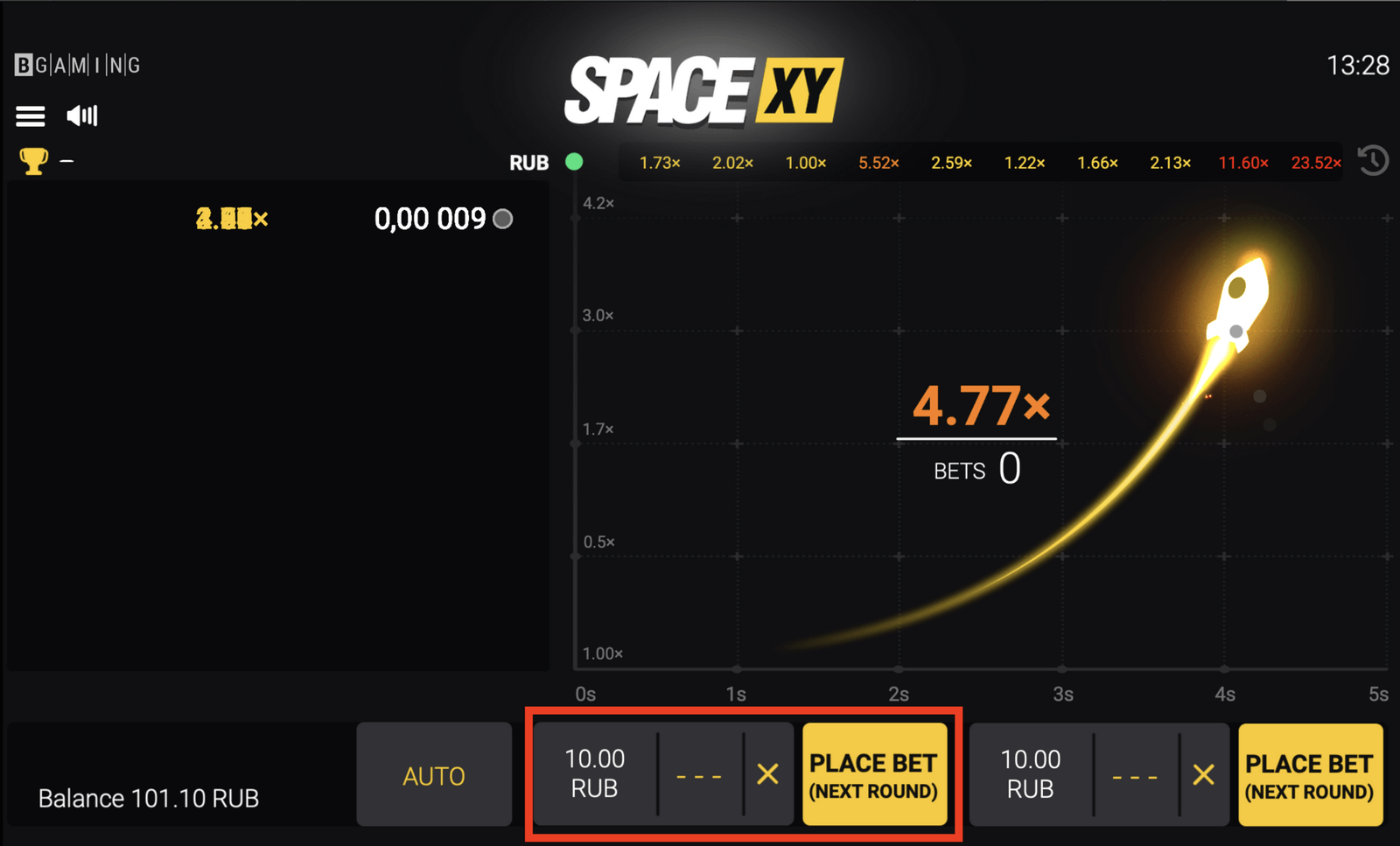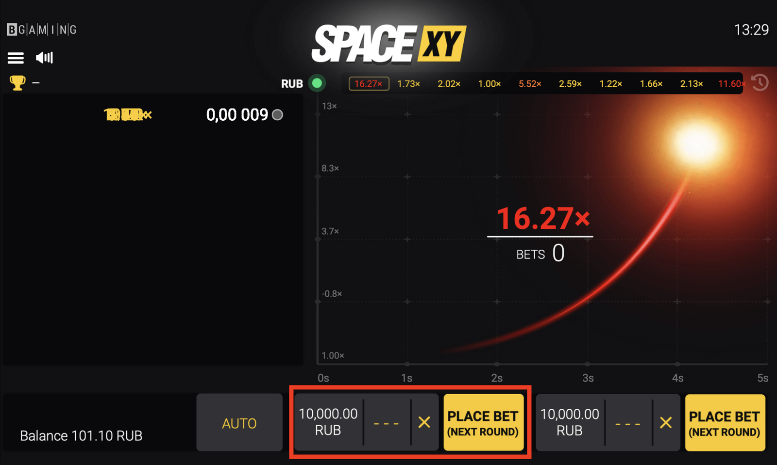 Space XY-nin hər raundunda minimum mərc yalnız 5 rubl təşkil edir. Bu, kiçik bir büdcə ilə oyun taktikanızı sınamaq üçün əla fürsət təqdim edir. Doğru strategiya seçiminə inam güclənən kimi siz böyük mərclərə keçə və müvafiq olaraq böyük uduşlar əldə edə bilərsiniz. 50, 100, 500 və 1000 rubl nominal dəyəri olan mərclərin sürətli seçimi də mövcuddur. Bahisin nominal dəyərini əl ilə əlavə edərkən, addım 5 rubl təşkil edir.