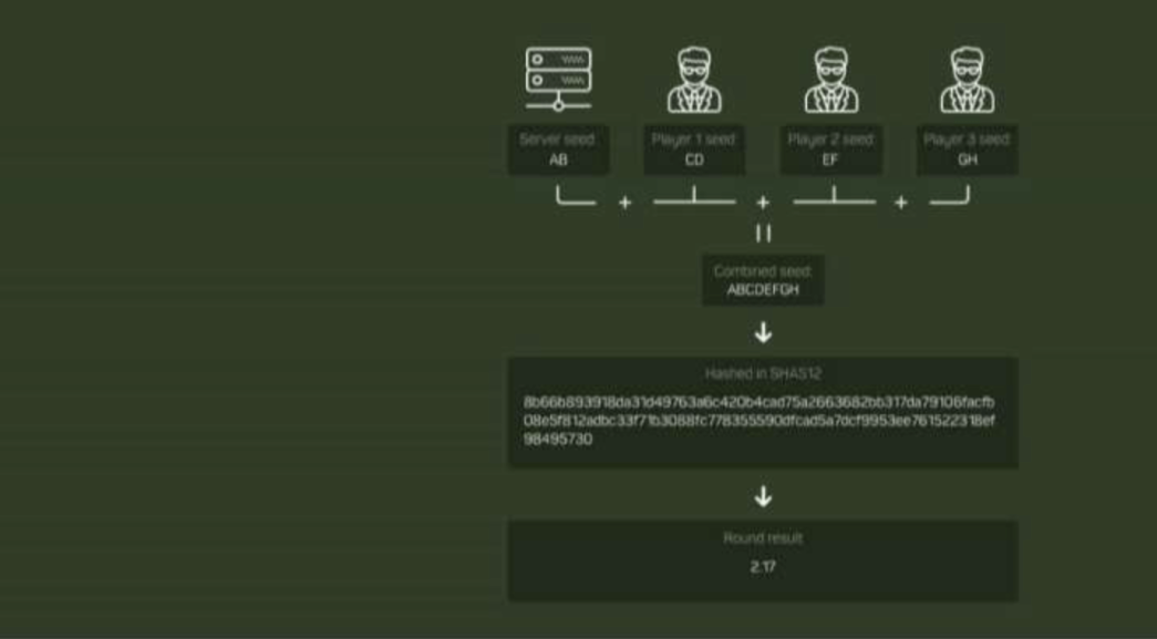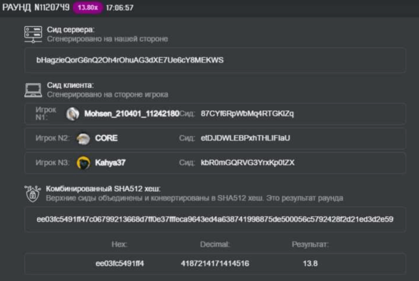 Oyun tarixçəsindəki nəticə ilə düyməni vura bilərsiniz (oyun pəncərəsinin yuxarısında oynanan əmsallar). Açılan pəncərədə server toxumunu, 3 oyunçu toxumunu, birləşdirilmiş hashı və raundun nəticəsini görəcəksiniz. Haşın düzgünlüyünü istənilən onlayn kalkulyatorda yoxlamaq olar.