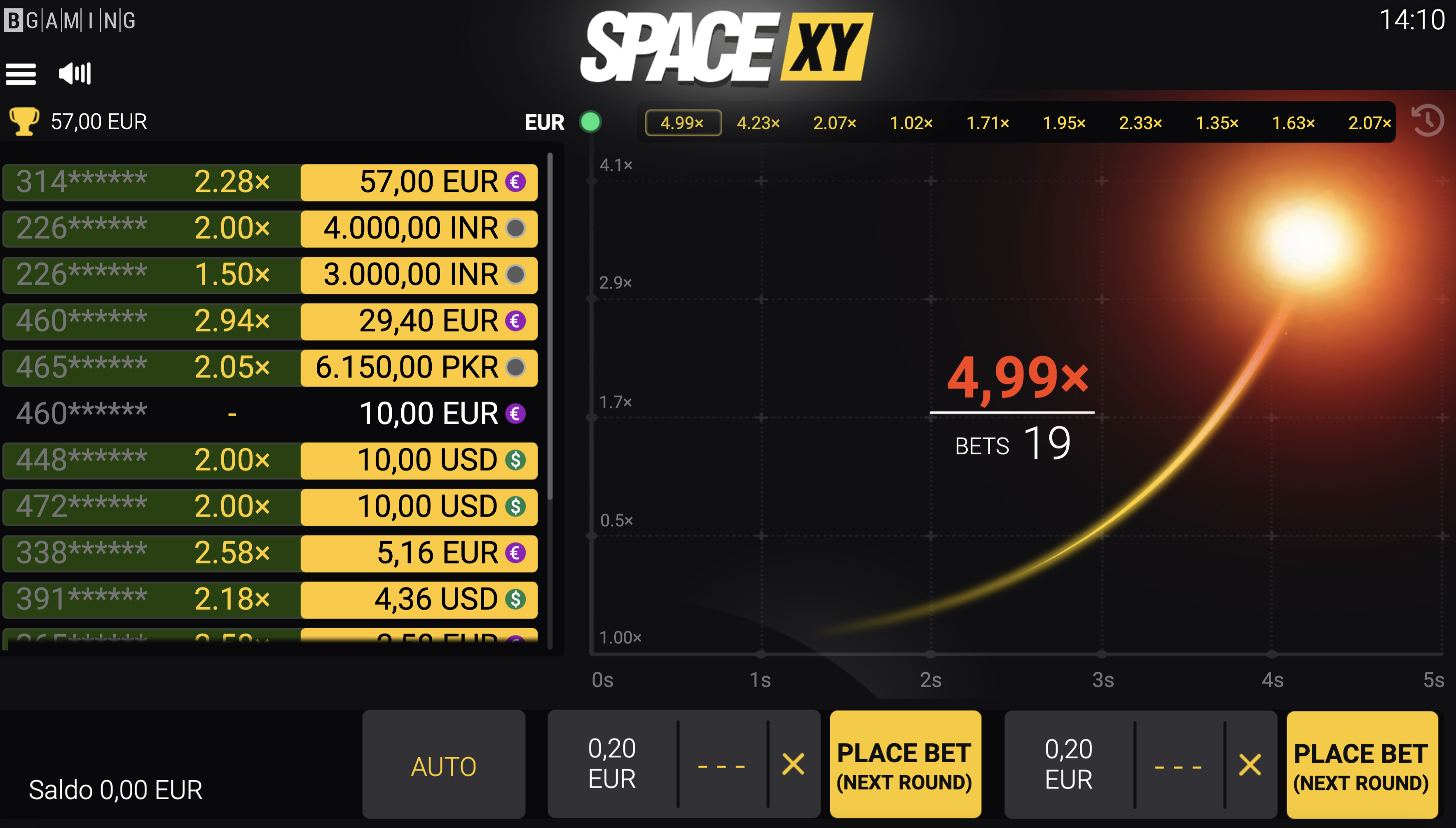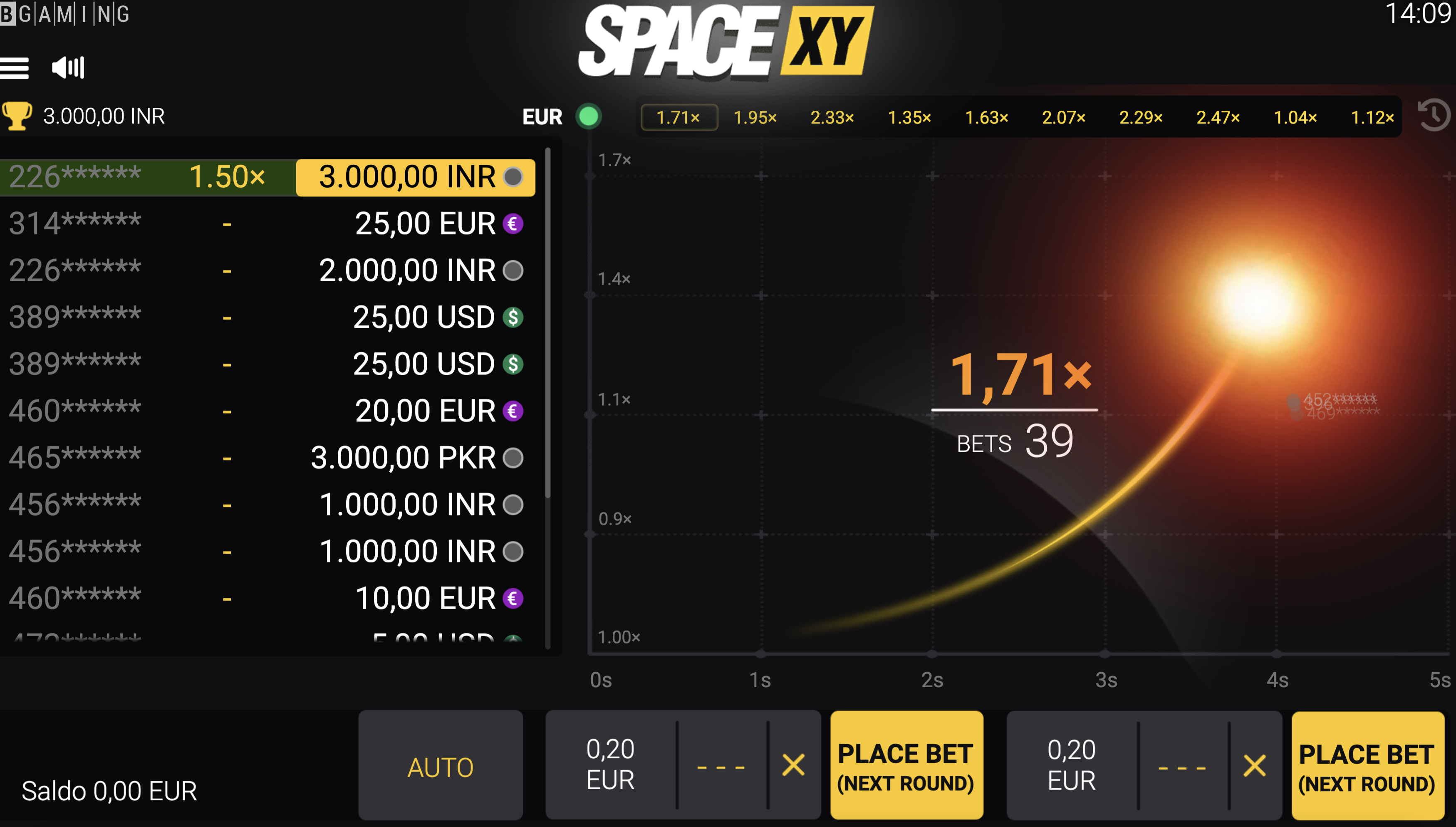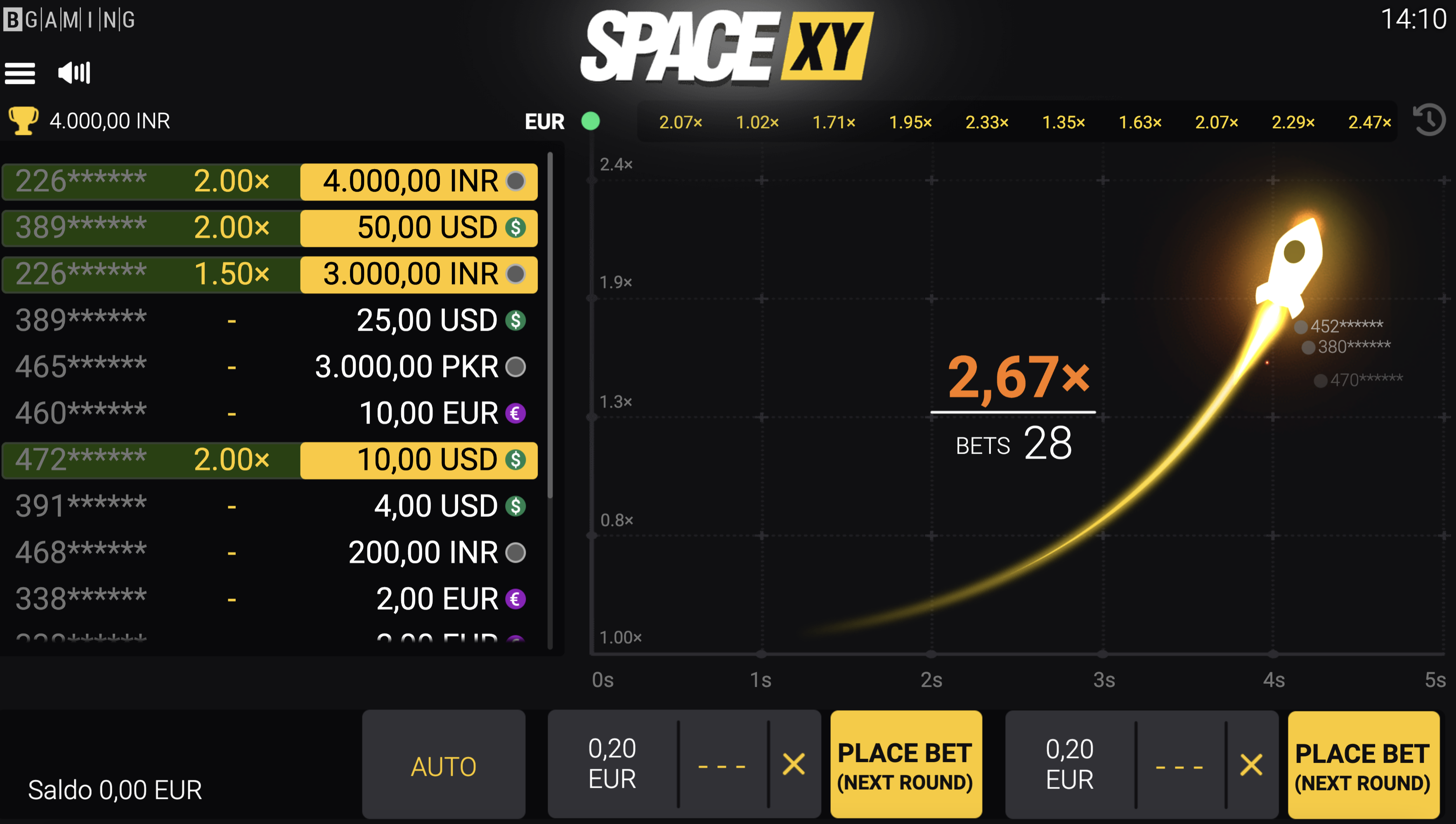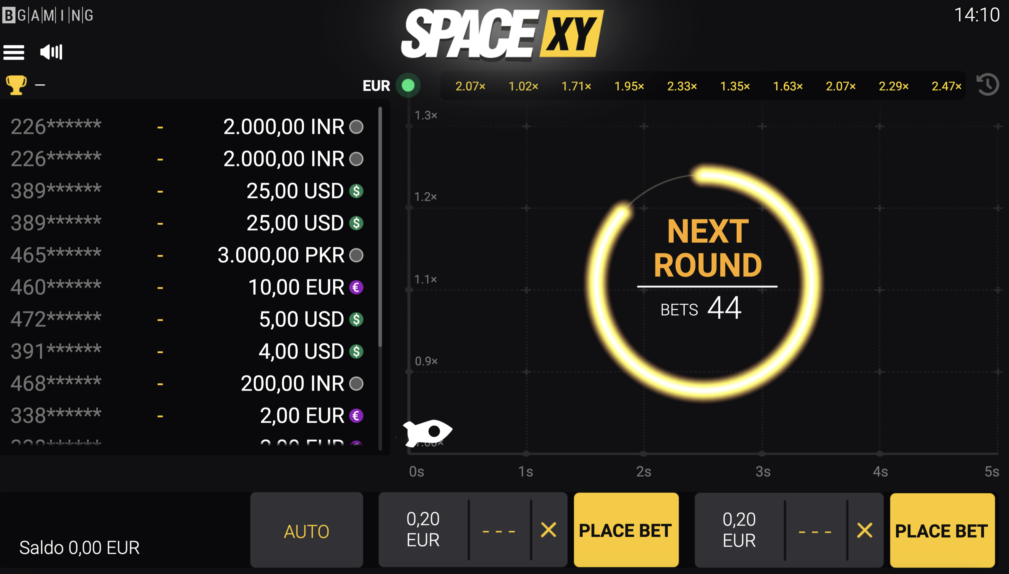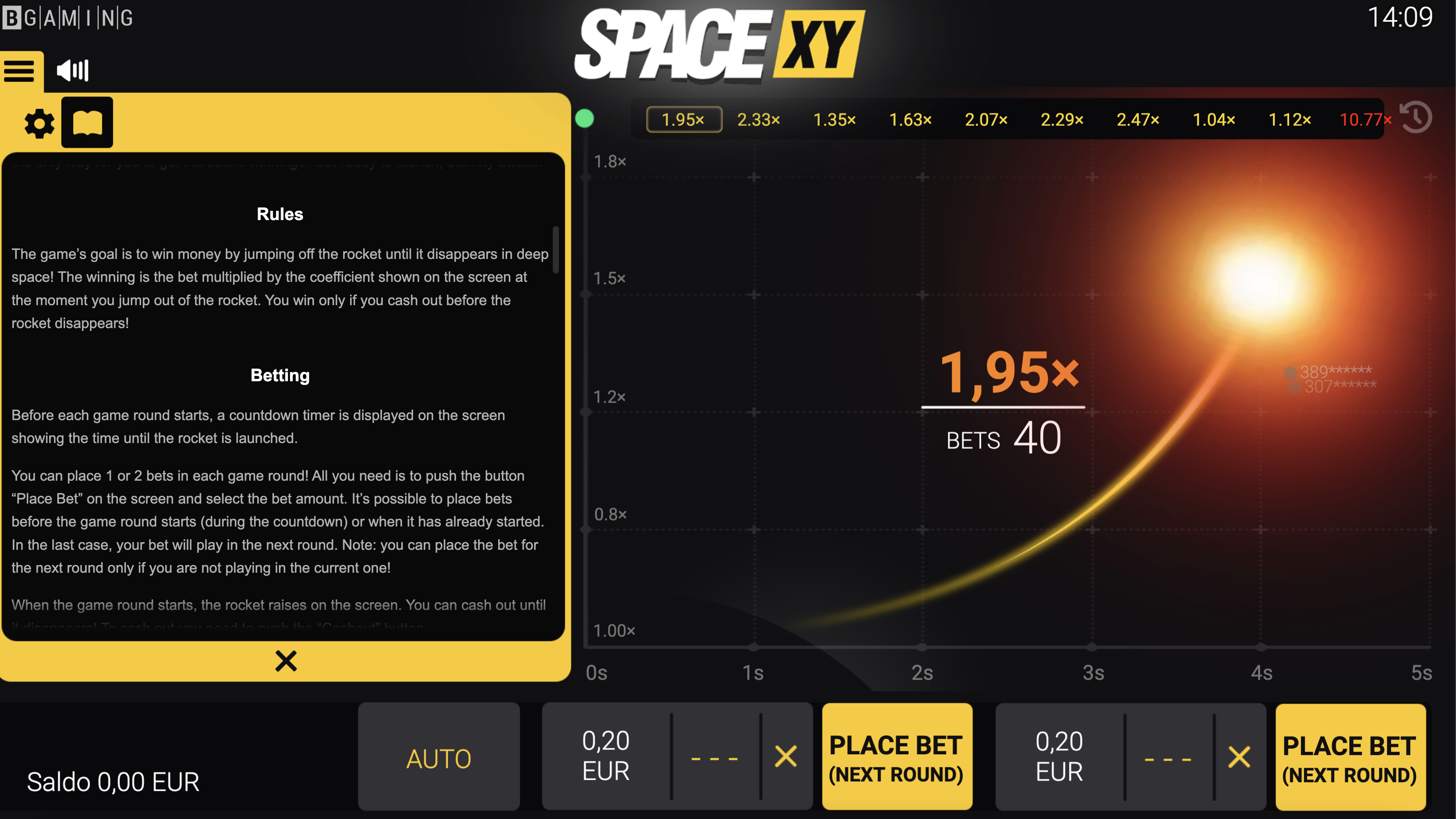 Las tres razones son racionales. Sin embargo, Space XY no está disponible en modo de demostración. No podrás probar Space XY como muchos otros juegos en línea. Pero no te enfades. Puedes ver a otros jugadores y sesiones de juego. La única condición es registrarse y recargar la cuenta. Así, después de observar a los jugadores, harás tu propia opinión sobre cómo jugar Space XY. En general, la aleatoriedad define el juego de Space XY. Qué estrategia no planea: debe presionar el retiro a tiempo antes de que el avión comience a descender.