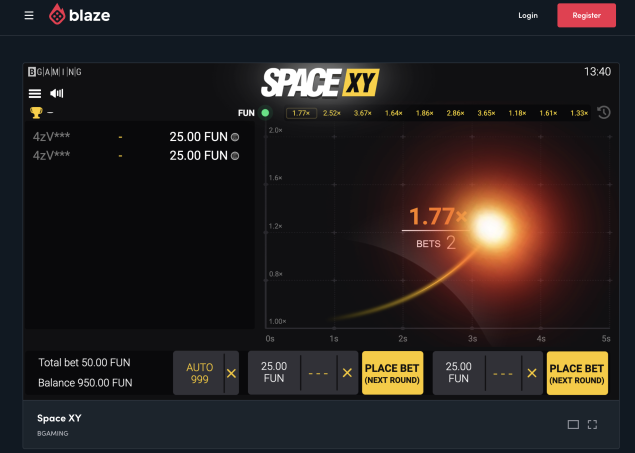 Sugerimos a nuestros jugadores que no se mantengan al margen de los grandes multiplicadores, sino que se registren en el casino en línea Blaze usando nuestro enlace y comiencen a jugar Space XY ahora mismo.