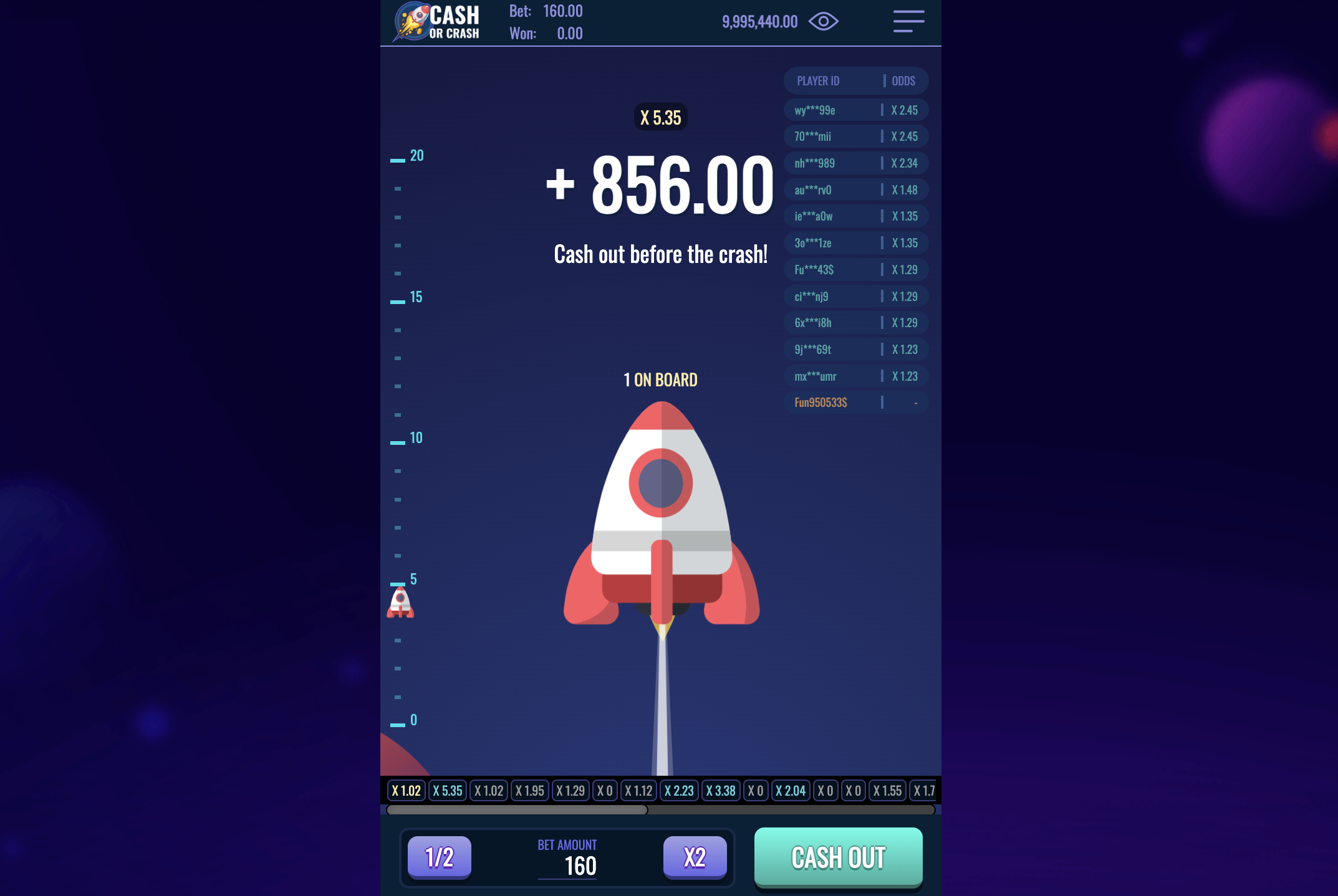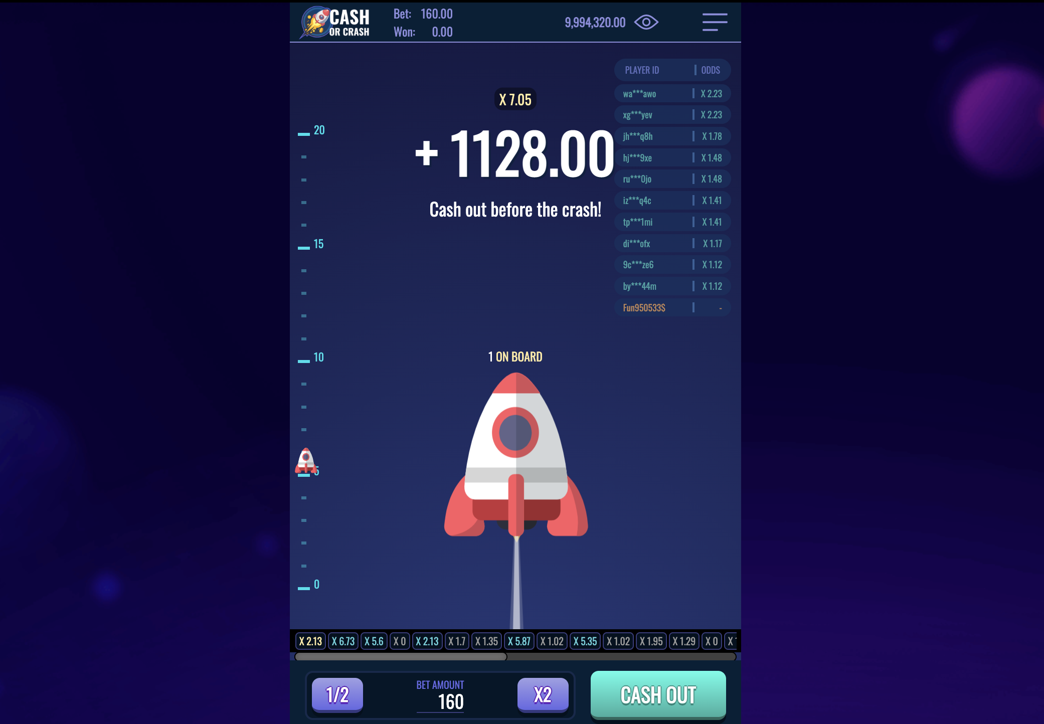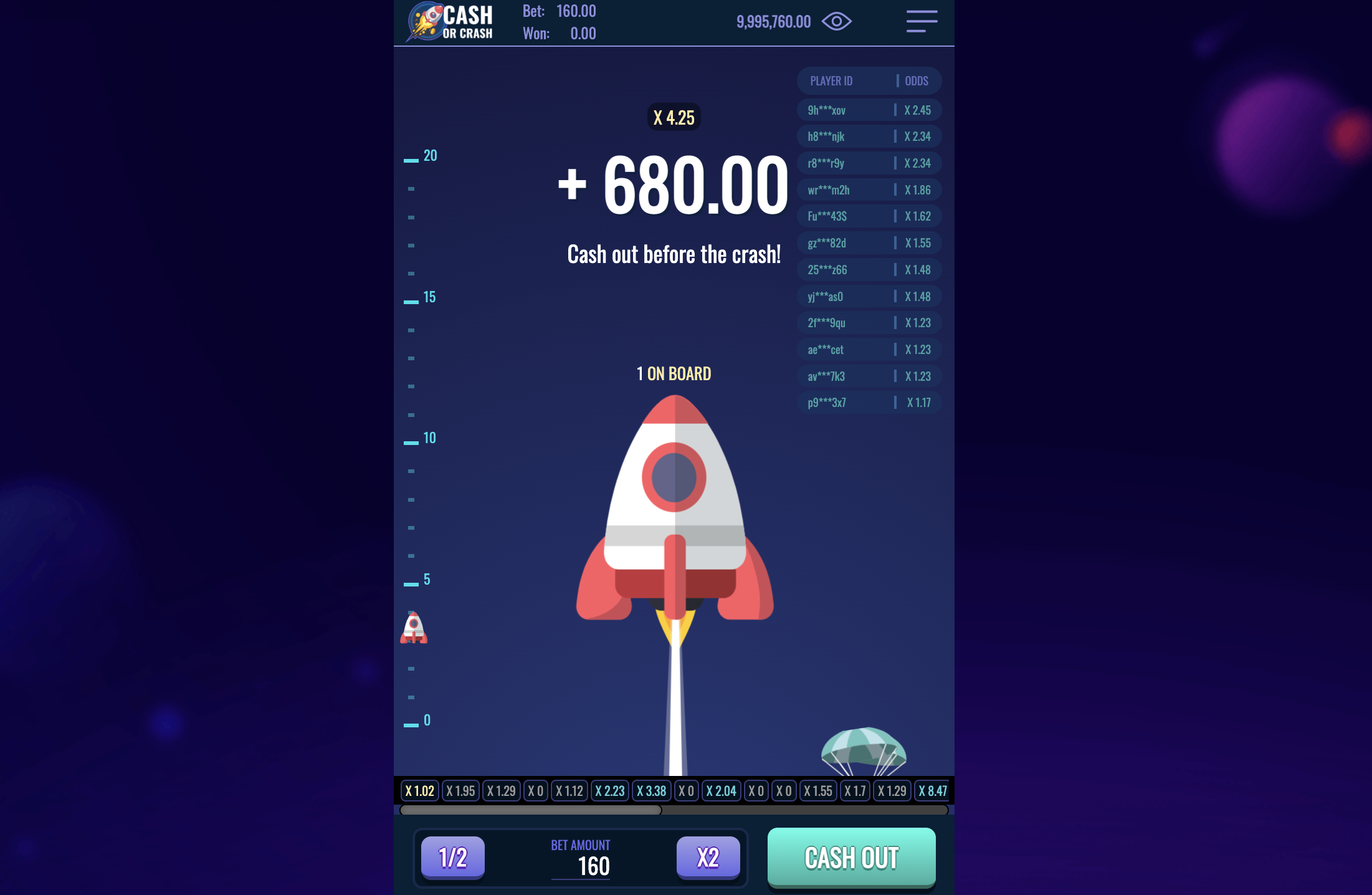 Cash or Crash – бұл ойыншыларды зымыран ұшағына бәс тігуге шақыратын онлайн ойын. Ойыншылар зымыран жоғары ұшатынына немесе ұшпайтынына бәс тігуі мүмкін. Ойыншылар сондай-ақ өздері қабылдағысы келетін тәуекел деңгейін және өздері қалаған ставканы таңдай алады.