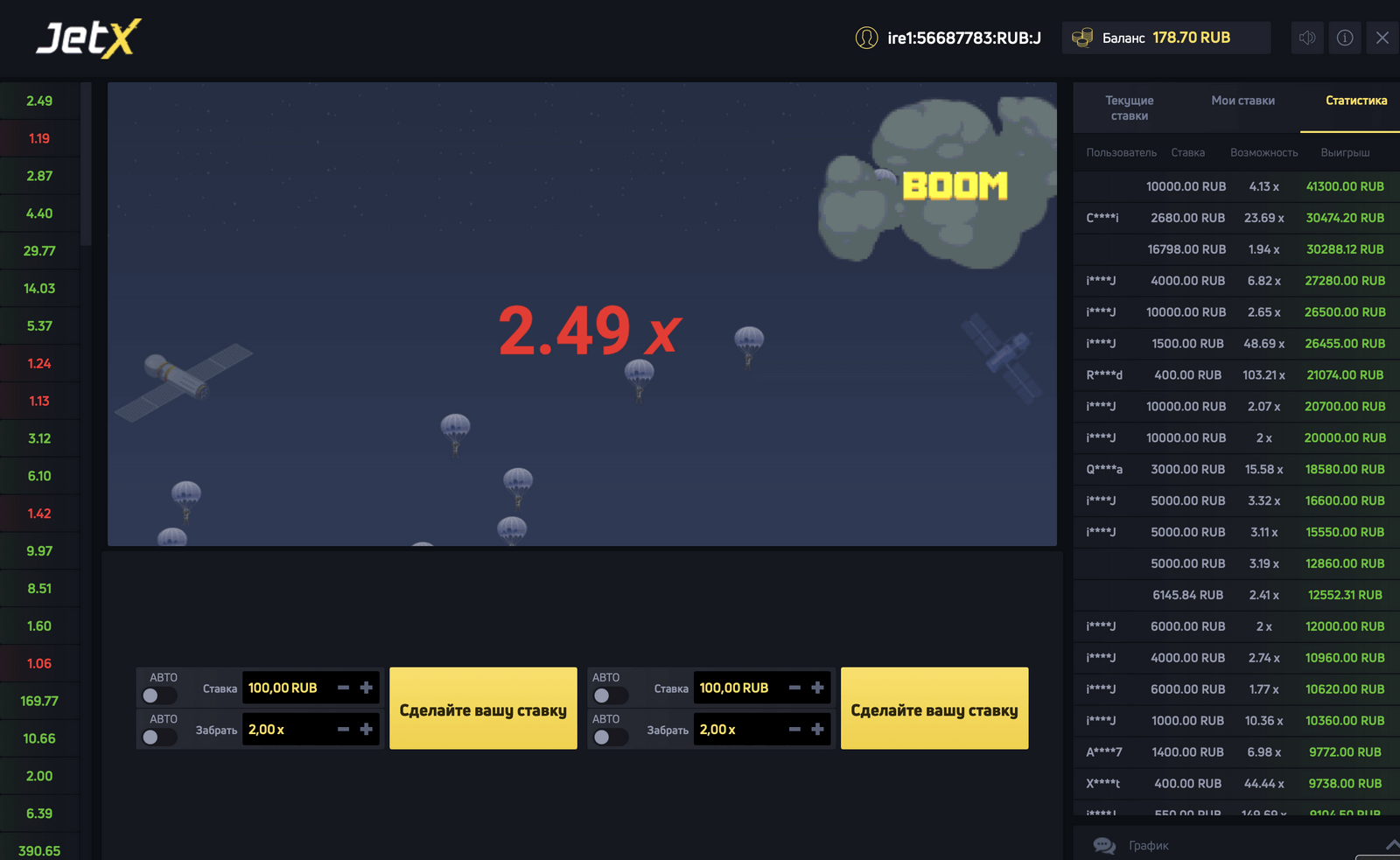 Жоғарыда айтылғандай, мақсат – ұшақ апатқа ұшырамас бұрын. «Жинау» түймесін басу jet x айналымын бірден аяқтайды және, әрине, жинақталған мультипликаторға көбейтілген үлеске тең jetx ақшалай сыйлығын береді. Рулетка слоттары сияқты, экранның сол жағында алдыңғы раундтардың нәтижелерін көрсететін нәтижелер журналы кестесі бар, егер jet x сізге көмектессе.