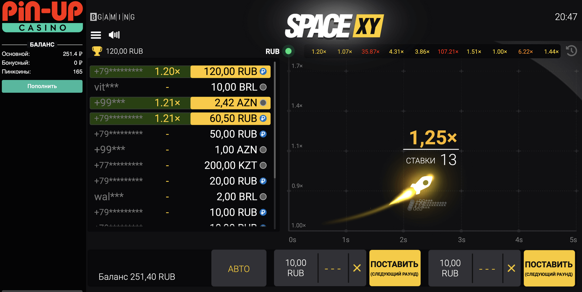 Space XY ойынын ойнау үшін ресми Pin-Up веб-сайтында тіркелу сіздің қаржыңыздың қауіпсіздігінің және Provably Fair-тен адал ойынның кепілі болып табылады. Сондай-ақ, Space XY Pin-Up ойынында тіркелу есептік жазбаңызды лезде толтыруға, Pin-Up онлайн казиносындағы теңгерімді көбейтуге және тапқан қаражатты еш қиындықсыз алуға мүмкіндік береді.