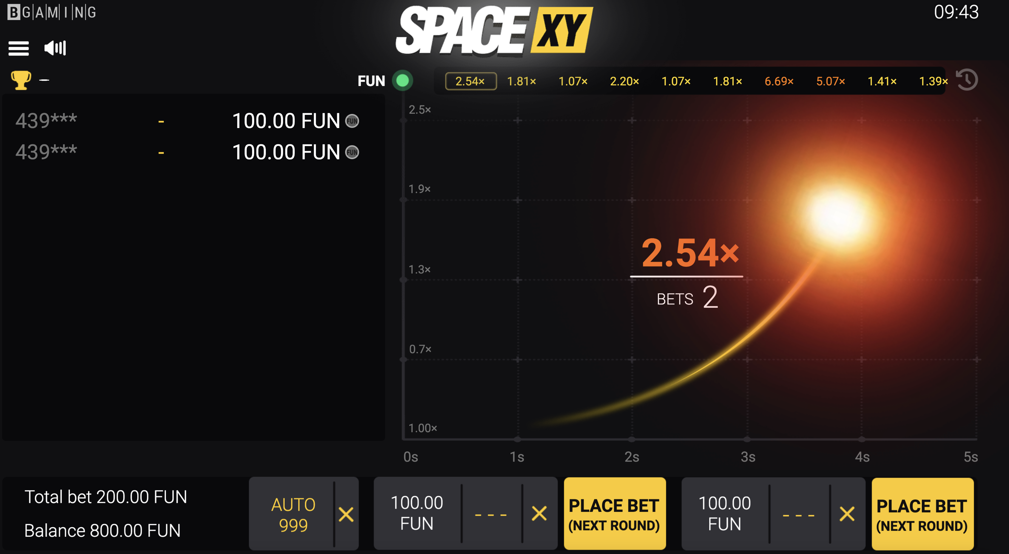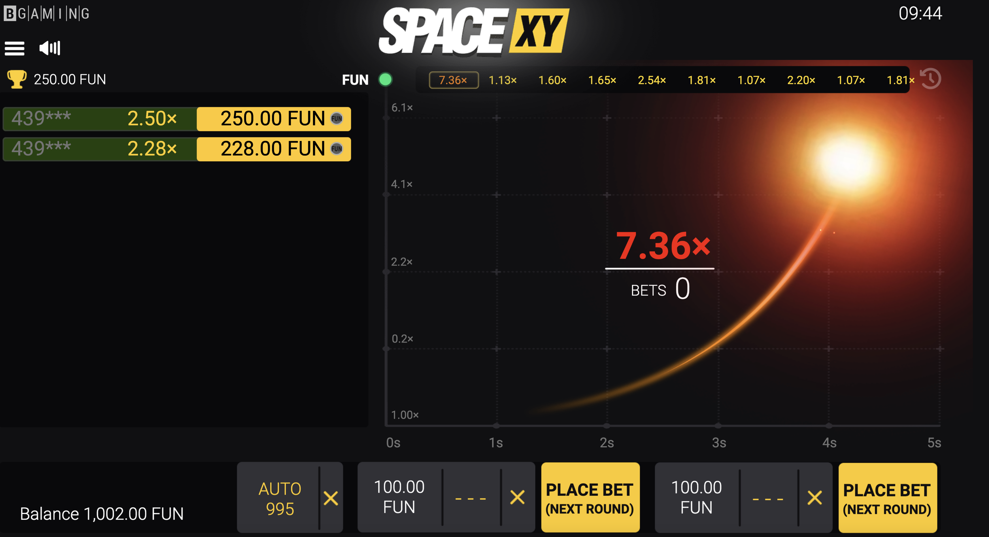 O campo de jogo mostra um fundo preto com as coordenadas X e Y, sobre as quais seu foguete deve voar. A coordenada X indica a duração do voo e a coordenada Y mostra os possíveis multiplicadores progressivos. Em nossa seção “Recursos do slot Space XY”, contaremos todas as nuances da jogabilidade!