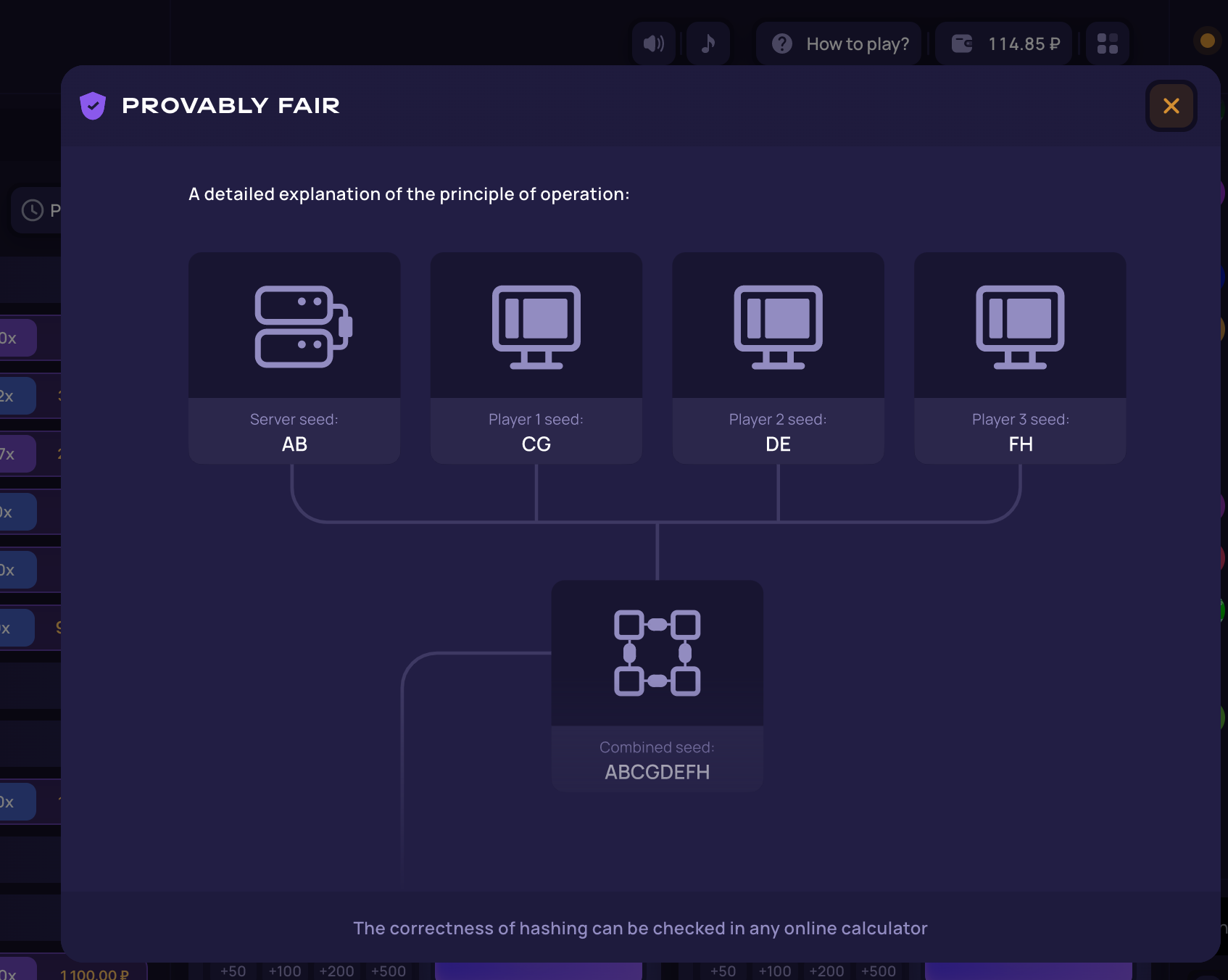Таким чином, будь-який гравець має можливість перевірити результати раунду. За запитом у вікні буде видно серверний сид, три клієнтські сиди, комбінований хеш і результати кожного раунду. Правильність формування даних завжди можна перевірити у будь-якому онлайн-калькуляторі.