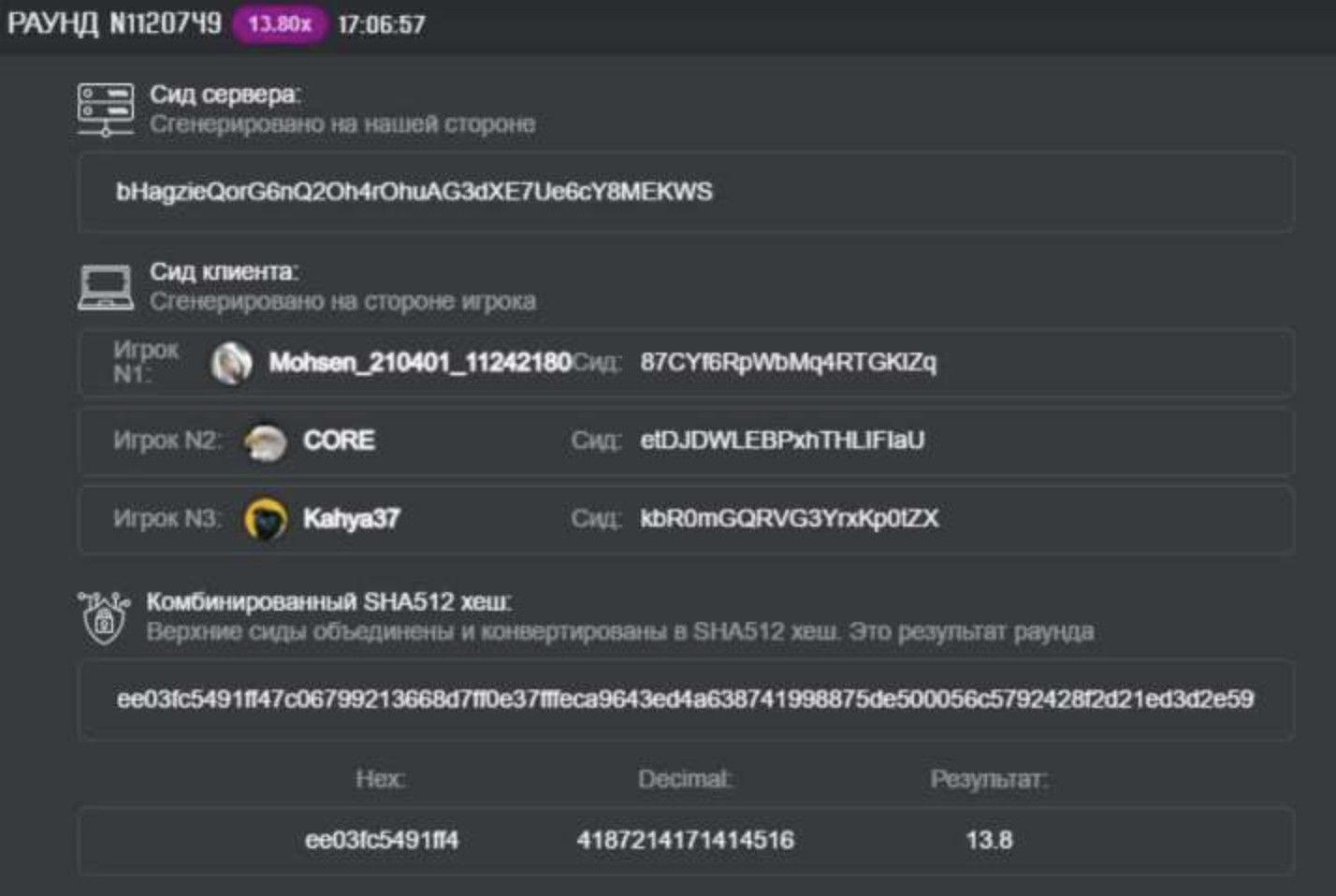 Siz o’yin tarixidagi natija bilan tugmani bosishingiz mumkin (o’yin oynasining yuqori qismidagi o’yin koeffitsientlari). Ochilgan oynada siz server urug’ini, 3 ta o’yinchi urug’ini, birlashtirilgan xeshni va tur natijasini ko’rasiz. Xeshning to’g’riligini har qanday onlayn kalkulyatorda tekshirish mumkin.