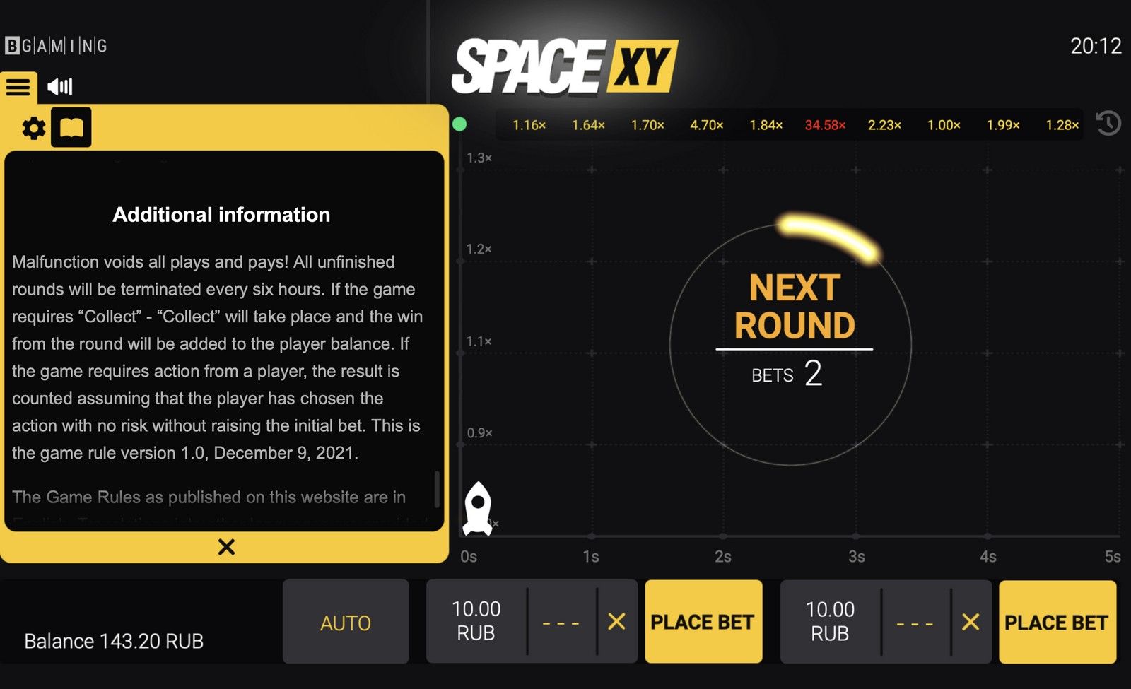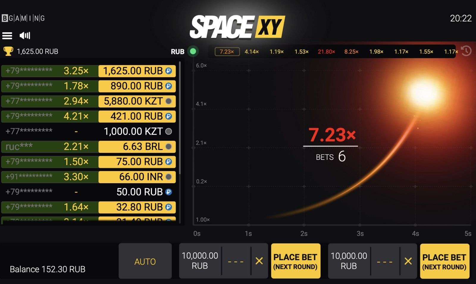 Space XY o’yinidagi har bir turning davomiyligi 8 dan 30 soniyagacha. Hammasi ushbu turda o’ynaydigan koeffitsientga bog’liq. Koeffitsient o’sib borayotgan bir paytda, raund davom etadi va sizning potentsial yutuqlaringiz o’sadi.