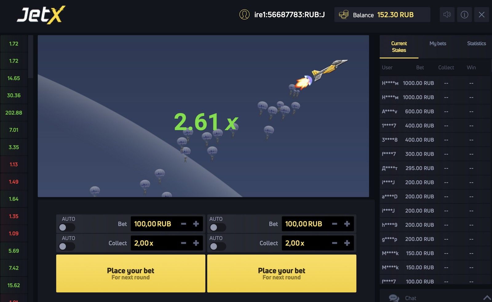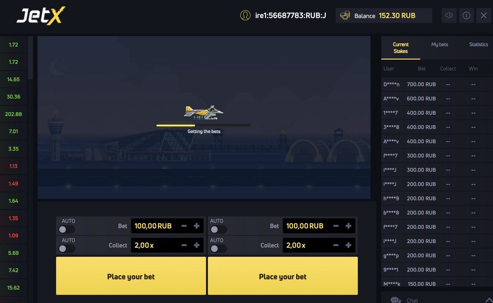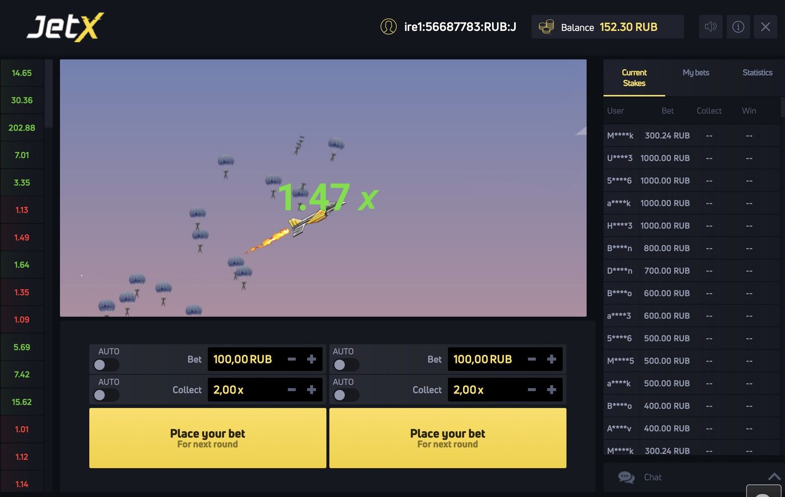 O’yinni yuklash jet x o’yinchilarni samolyotimiz uchib ketmoqchi bo’lgan uchish-qo’nish yo’lagiga olib boradi. O’yinchilar pul tikish oxirigacha boshlanishidan oldin o’rnatadilar va har bir tur uchun 0,1 dan 600 dollargacha tikish mumkin jet x. Oddiylik uchun tekislikni multiplikator egri chizig’i deb ataymiz. U raund boshlanishi bilanoq o’sishni boshlaydi va eng ta’sirlisi shundaki, u qanchalik baland bo’lishi mumkinligida chegara yo’q. Shunday qilib, g’alaba darajasi 0 dan cheksizgacha o’zgaradi. Biroq, bunday balandlikka ko’tarilish – utopik stsenariy, ammo nazariy jihatdan hali ham mumkin.. Nimani bilish muhim jetx
