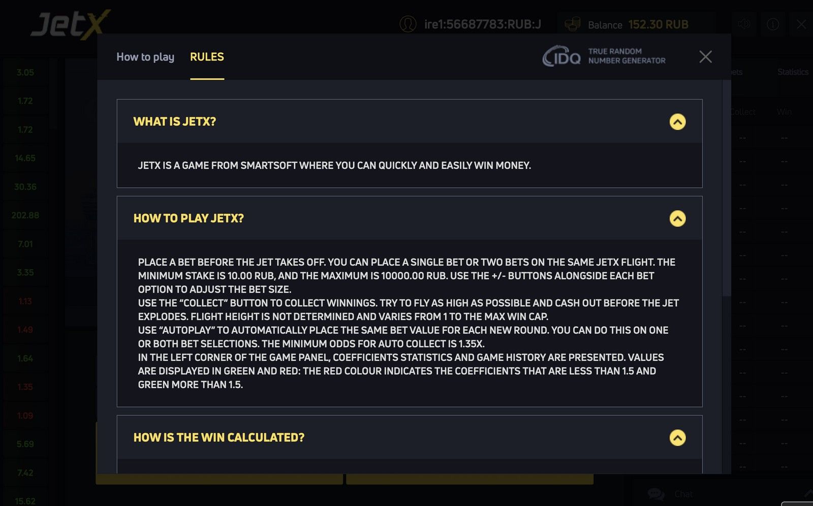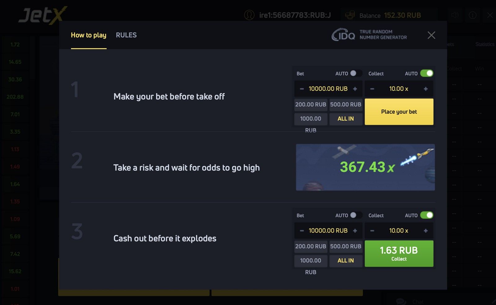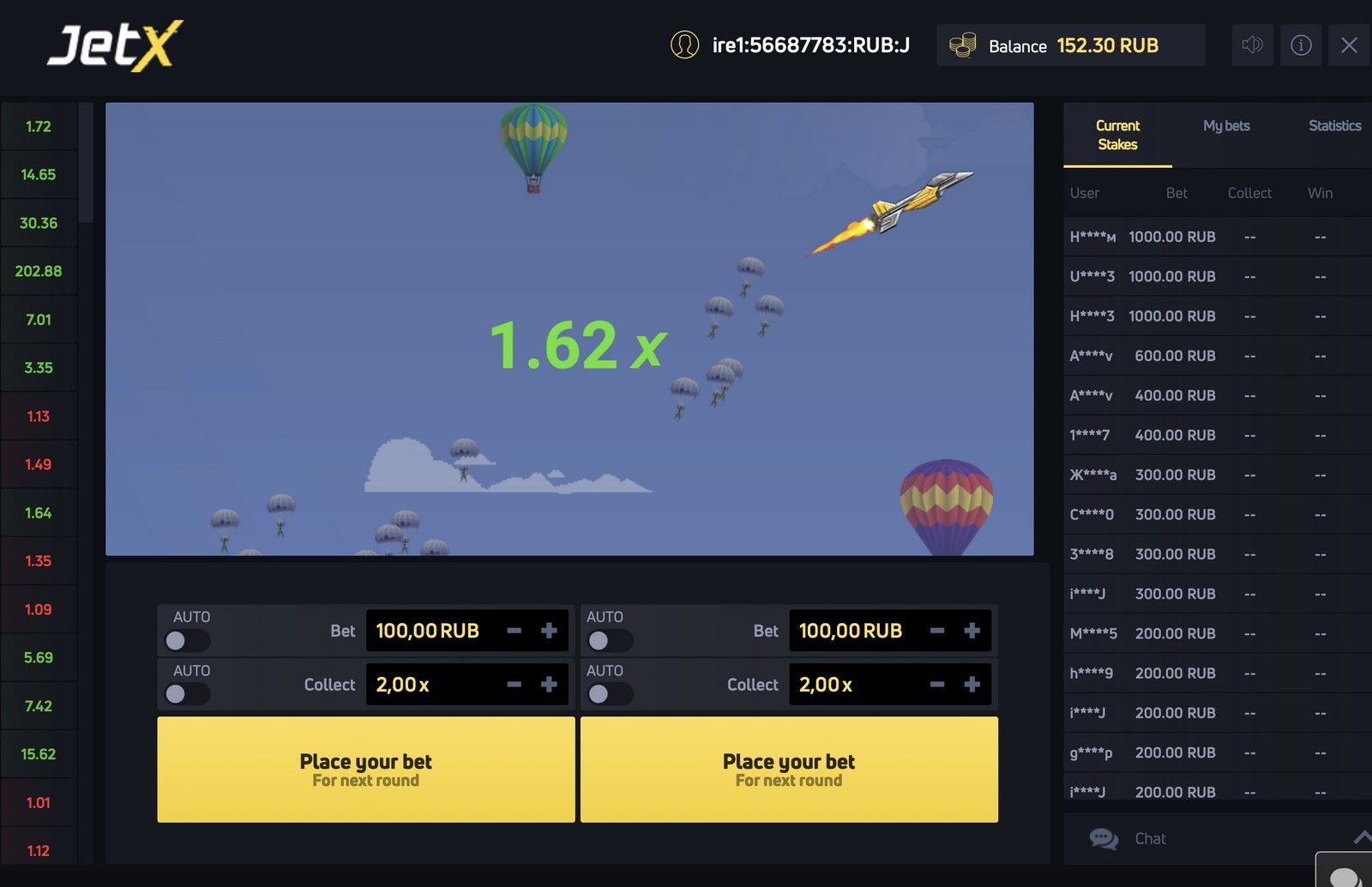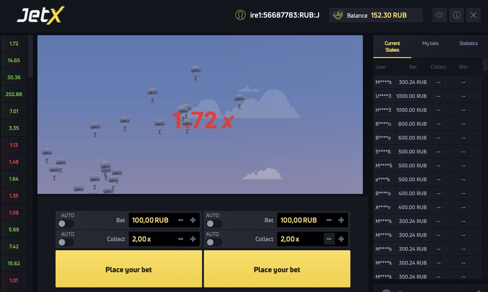 O’yinni yuklash jet x o’yinchilarni samolyotimiz uchib ketmoqchi bo’lgan uchish-qo’nish yo’lagiga olib boradi. O’yinchilar pul tikish oxirigacha boshlanishidan oldin o’rnatadilar va har bir tur uchun 0,1 dan 600 dollargacha tikish mumkin jet x. Oddiylik uchun tekislikni multiplikator egri chizig’i deb ataymiz. U raund boshlanishi bilanoq o’sishni boshlaydi va eng ta’sirlisi shundaki, u qanchalik baland bo’lishi mumkinligida chegara yo’q. Shunday qilib, g’alaba darajasi 0 dan cheksizgacha o’zgaradi. Biroq, bunday balandlikka ko’tarilish – utopik stsenariy, ammo nazariy jihatdan hali ham mumkin.. Nimani bilish muhim jetx