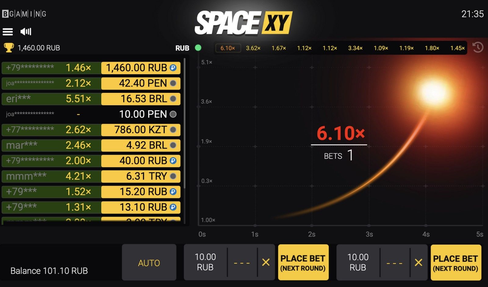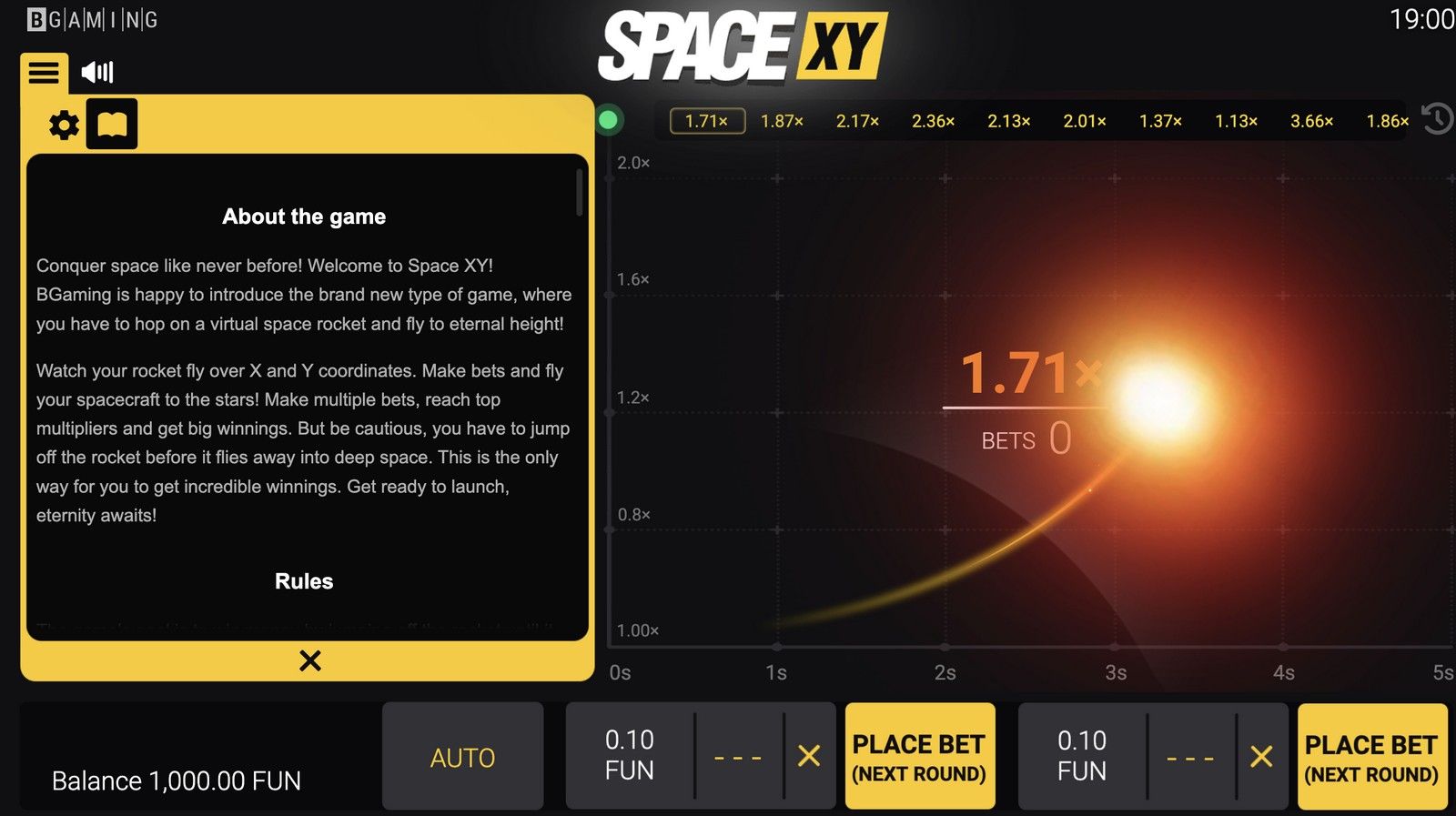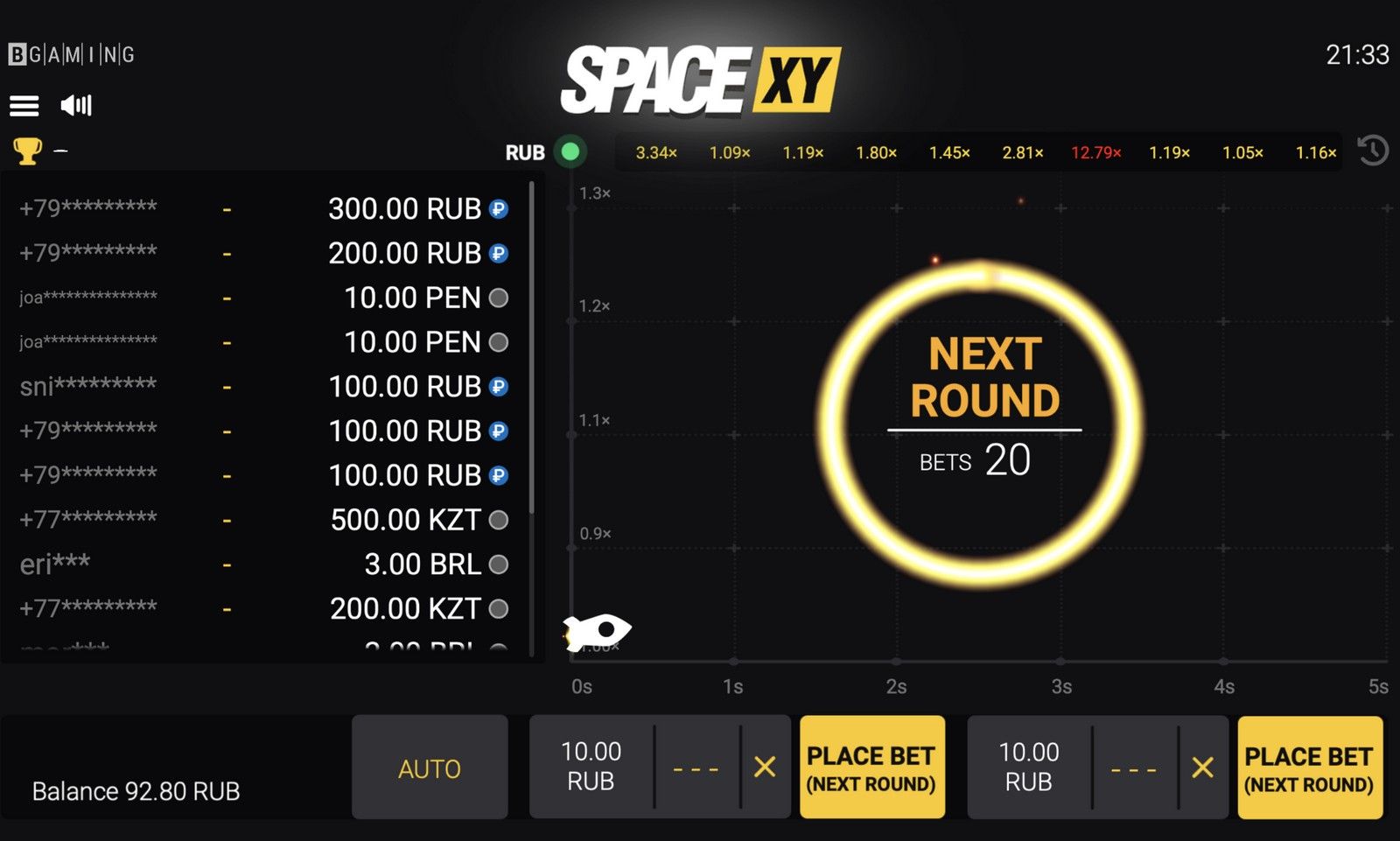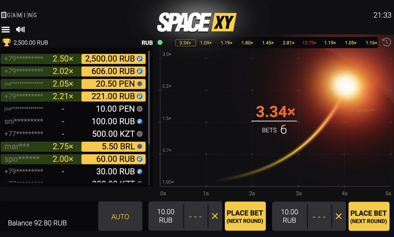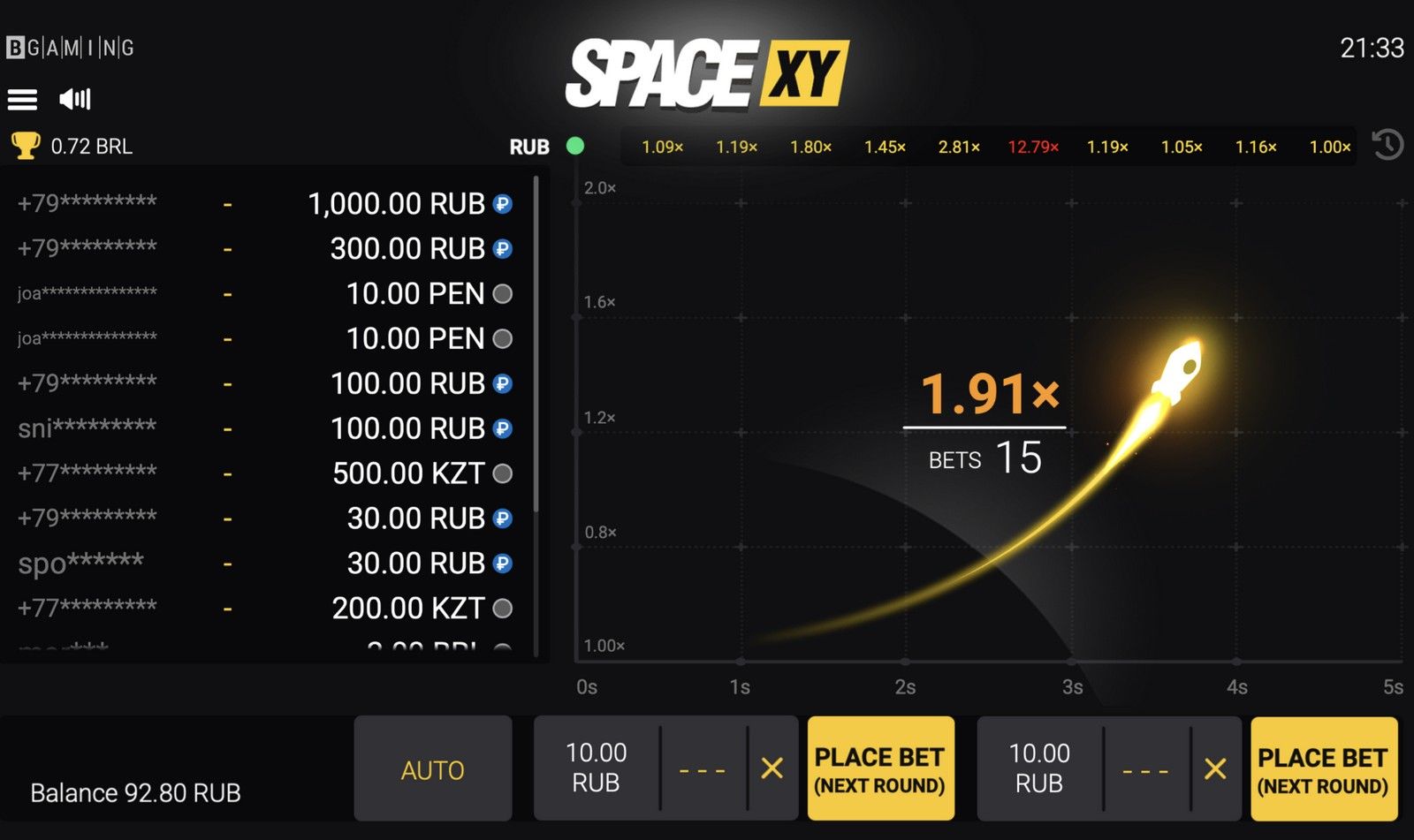 Uchala sabab ham mantiqiydir. Biroq, Space XY demo rejimida mavjud emas. Boshqa ko‘plab onlayn o‘yinlar kabi Space XY-ni sinab ko‘ra olmaysiz. Lekin xafa bo’lmang. Siz boshqa o’yinchilarni va o’yin seanslarini ko’rishingiz mumkin. Yagona shart – ro’yxatdan o’tish va hisobni to’ldirish. Shunday qilib, o’yinchilarni tomosha qilgandan so’ng, siz Space XY qanday o’ynash haqida o’z fikringizni bildirasiz. Umuman olganda, tasodifiylik Space XY o’yinini belgilaydi. Qaysi strategiyani rejalashtirmang – samolyot tushishni boshlashdan oldin naqd pulni o’z vaqtida bosishingiz kerak.